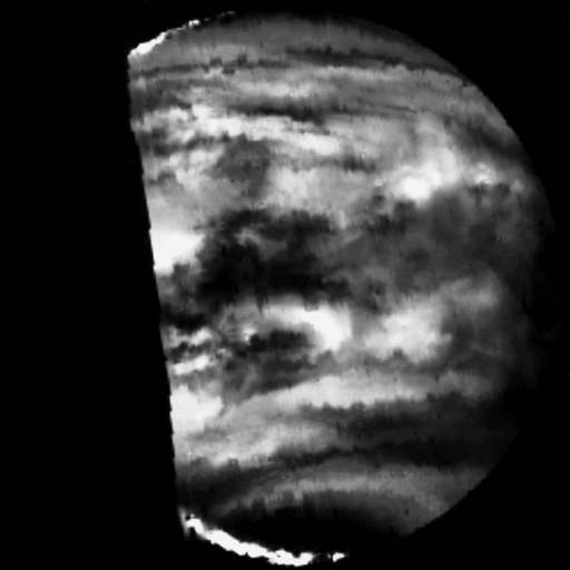 | The Venusian cloud layers block a direct view of the surface in visble light, but a few infrared windows have been found. Through these, radiant heat from the surface can be viewed on the night side of Venus. |
